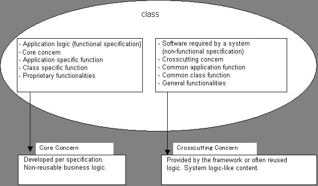 In a strict object oriented design, common functionalities (Core Concerns) are implemented in the same class as Crosscutting Concerns such as logging, declarative transaction, database connection, exception handling, security, and distributed transaction.