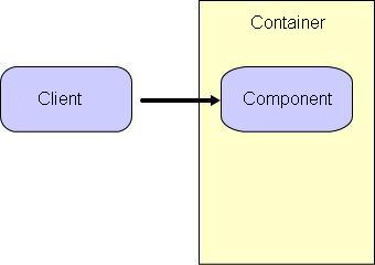 When remote calls is not used, client application/component has the relationship with S2 container component as shown in the following diagram. (It is possible for a client to also use a S2 container.)