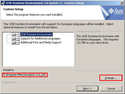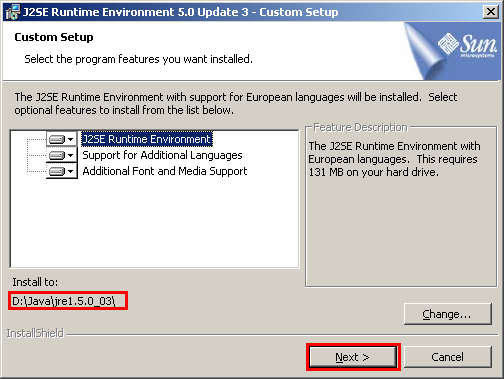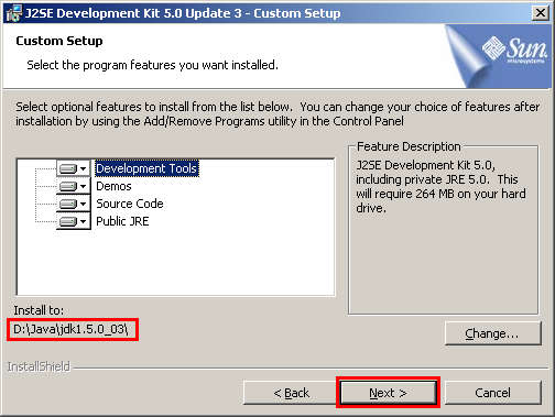 After J2SE Development Kit 5.0 is installed, J2SE Runtime Environment 5.0 is installed. Change the Install to: directory to match the J2SE Development Kit 5.0 directory.