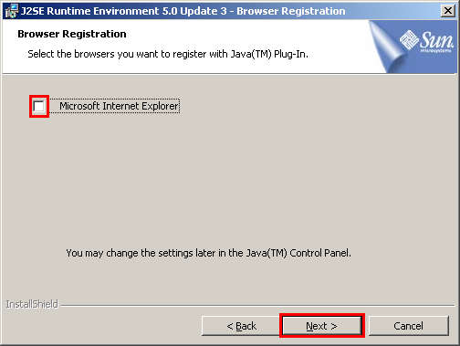 Uncheck Microsoft Internet Explorer to not install Java plug-in in Microsoft Internet Explorer.