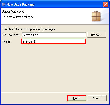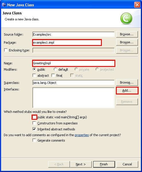 We will create this class in folder "impl". Change the Package from "examples1" to examples1.impl" to tell Eclipse to create a new folder "impl" under "examples1".