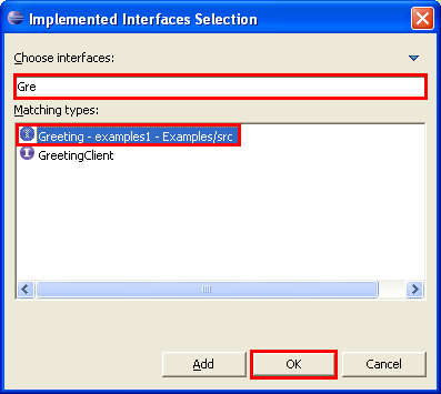 In the "Choose interfaces:" begin entering Greeting, list of all matching interfaces will be displayed. Select Greeting - examples1 - Examples/src from the list and select the OK button.