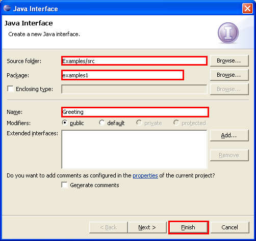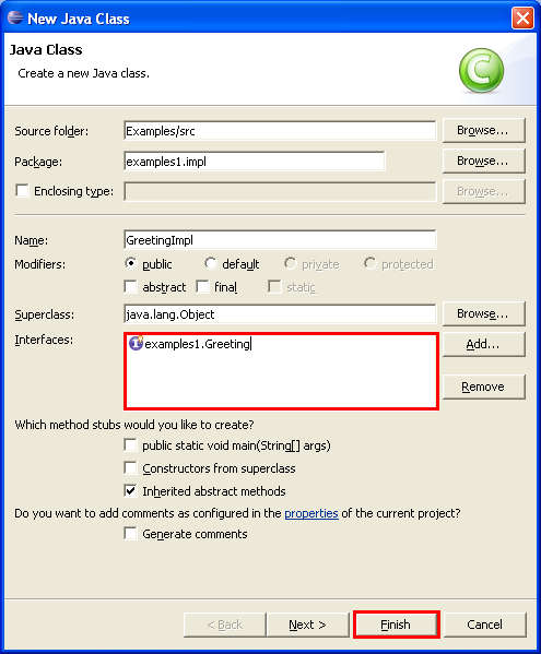 Make sure "examples1.GreetingClient" is displayed in the "Interfaces" list box and select the Finish button.