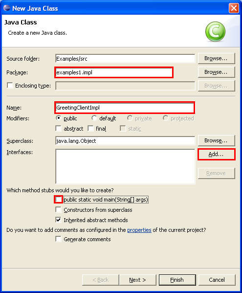 Enter examples1.impl as a "Package" and GreetingClientImpl as the Name and verify that public static void main(String[] args) is unchecked.
