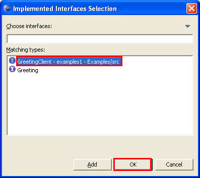 Select GreetingClient - examples1 - Examples/src from the list. If it is not displayed, enter GreetingClient in the "Choose interfaces".