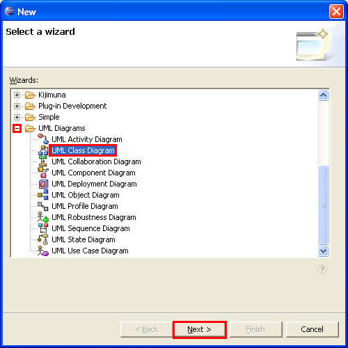 Expand the UML Diagrams by clicking on the + the right of it. Since we want to create a new class diagram, select UML Class Diagram and select the Next > button.