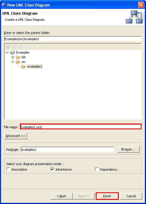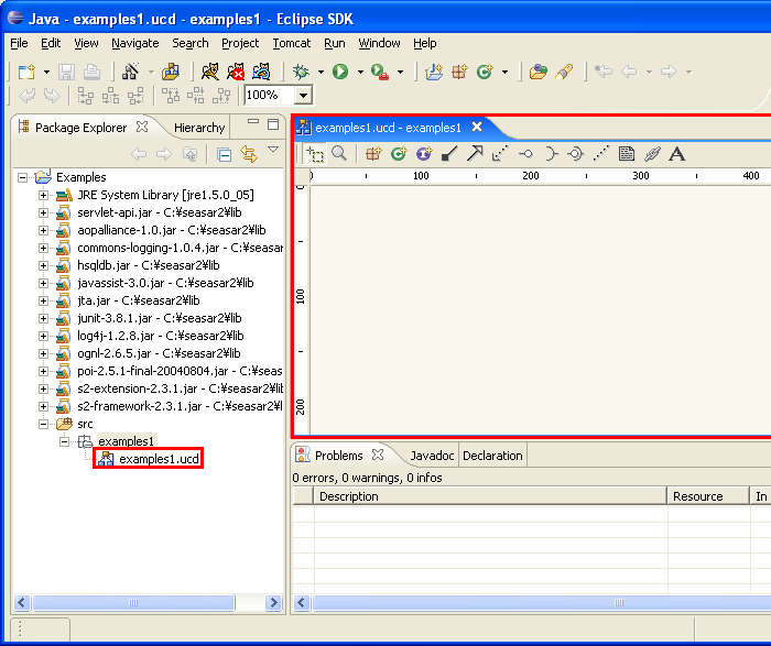 An empty class diagram should appear and file "examples1.ucd" should appear under "examples1".