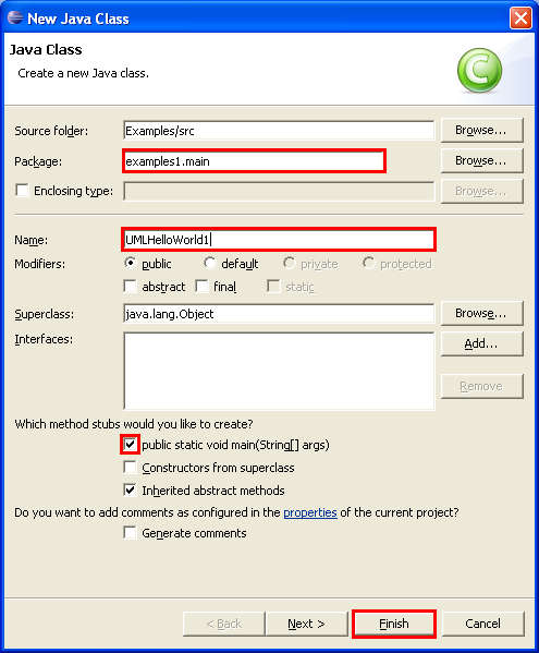 Enter examples1.main as the "Source folder:", UMLHelloWorld1 as the "Name", and check the public static void main(String[] args). Select the Finish button.