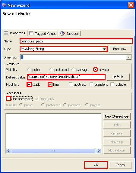 Enter configure_path as the "Name", java.lang.String, enter "examples1/dicon/Greeting.dicon" as the Default value, select private as the "Visibility of Attribute", check static and final as Modifiers, and uncheck Use accessors.