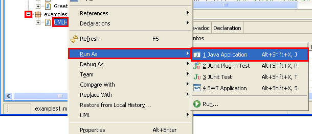 Double click on "main.UMLHelloWorld1" and select the UMLHelloWorld1.java. Enter the codes to the main method. Be sure to also add "import".